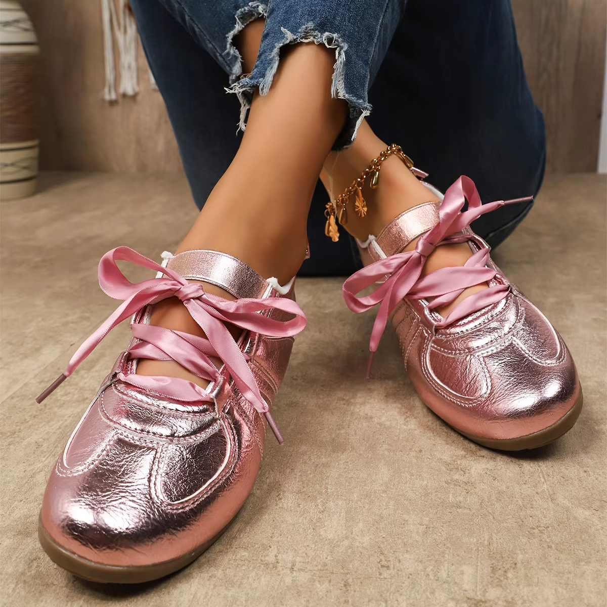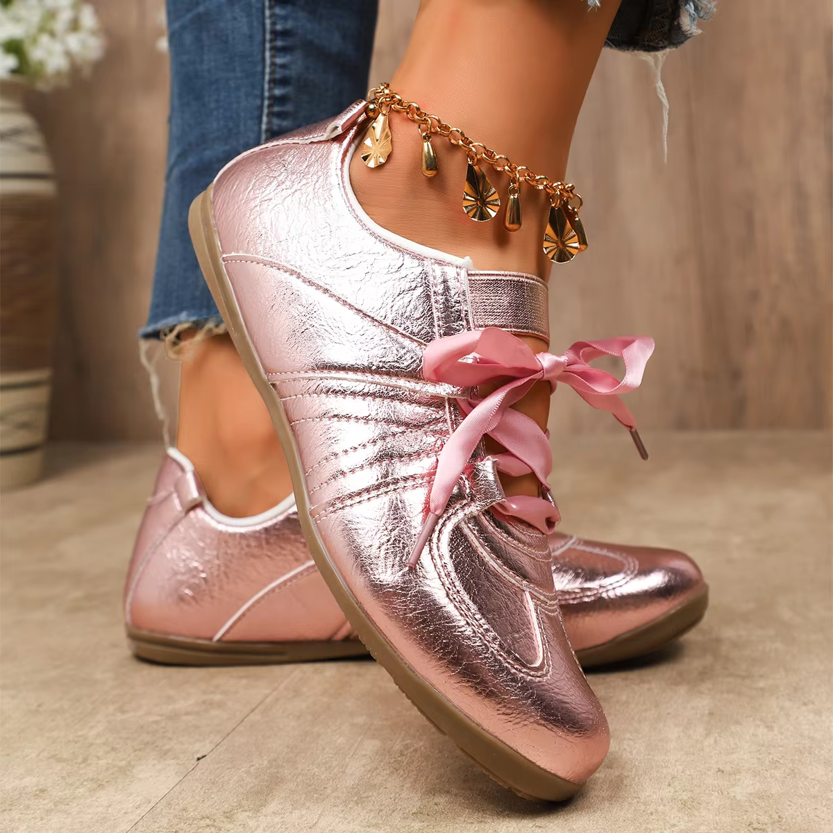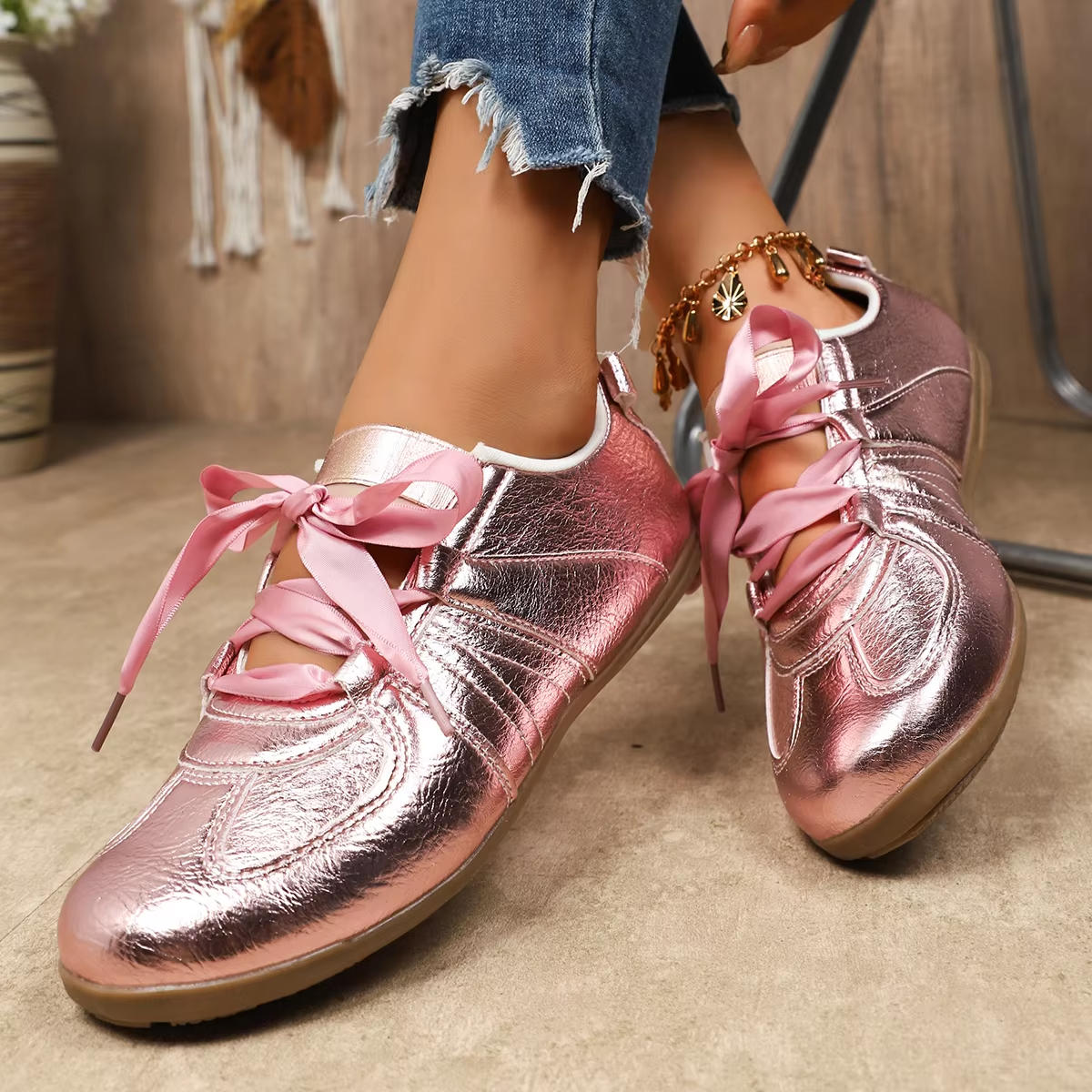 Bairuilun Women's Luxury Outdoor Golden Flat Ribbons Sneakers Fashion Women Pink Satin Casual Walking Shoes
