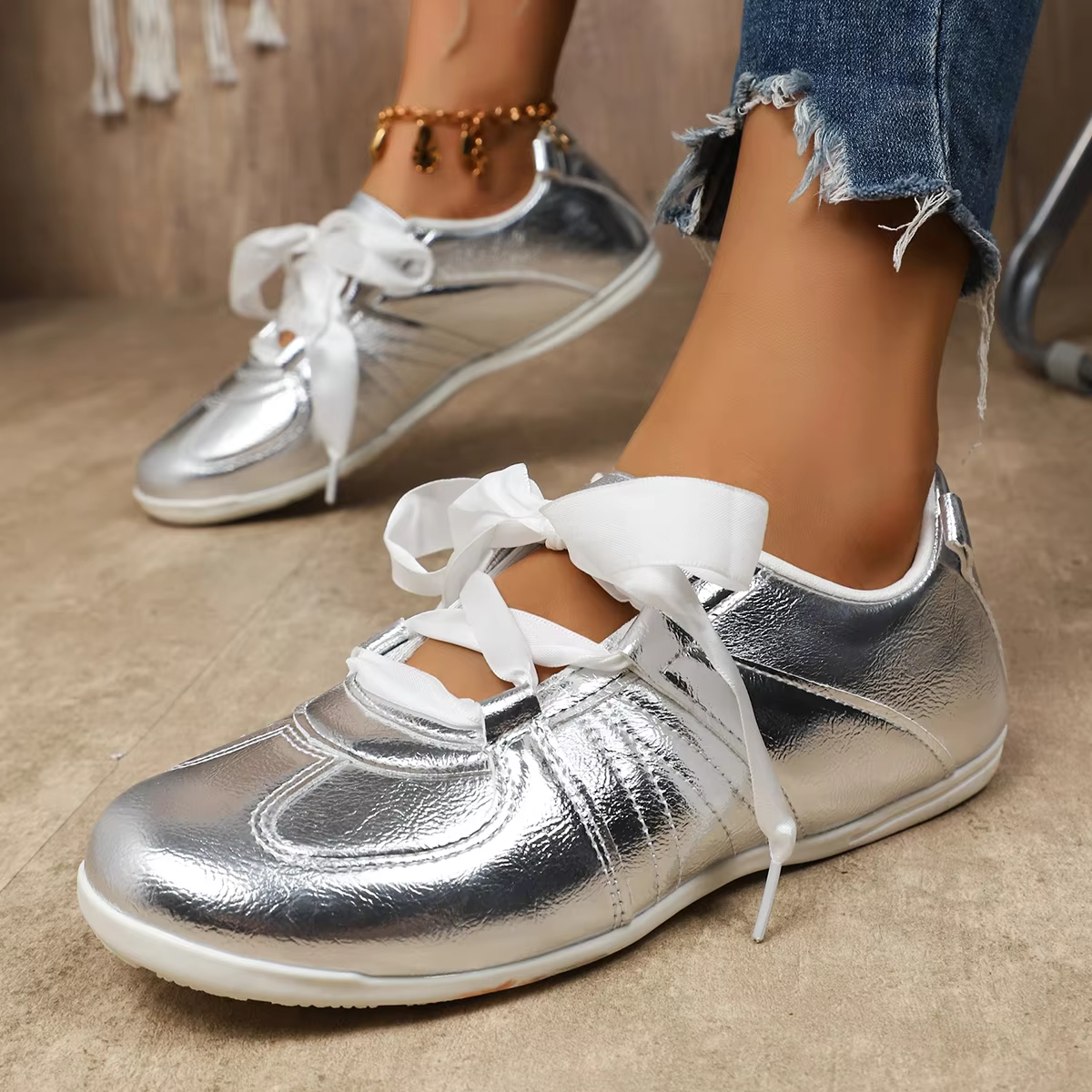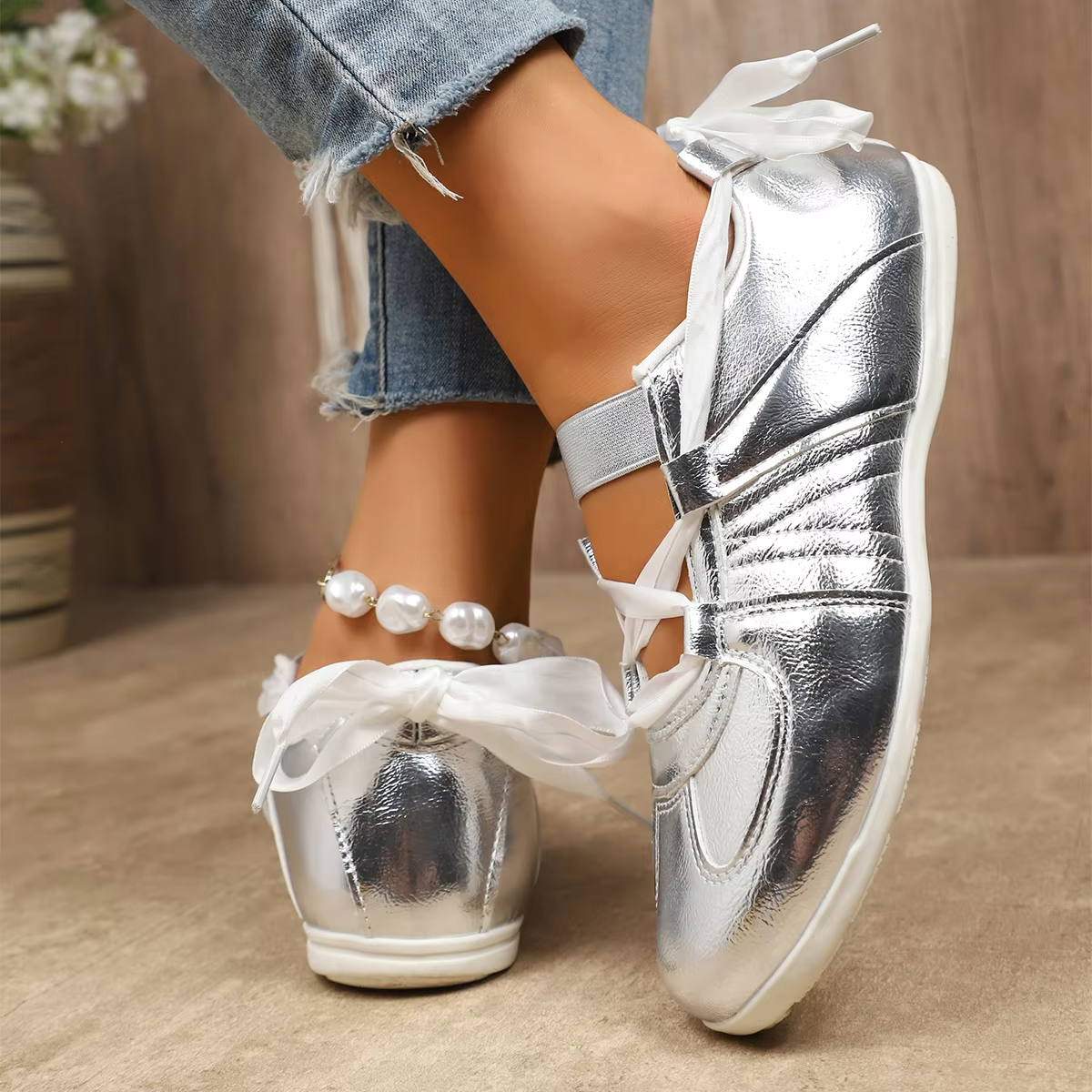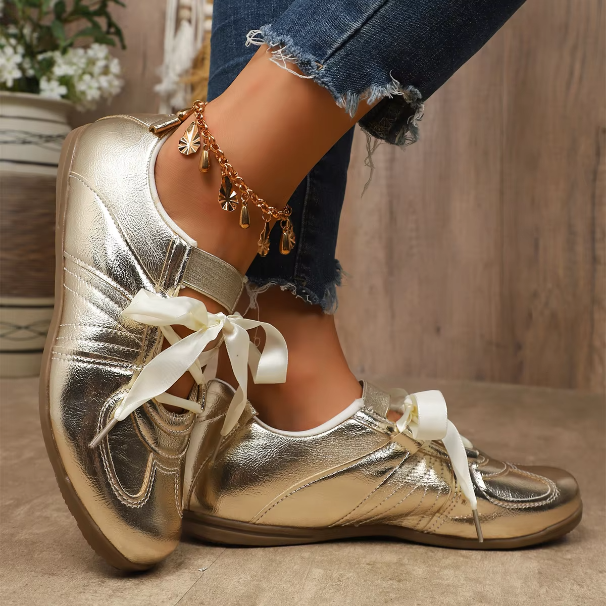 Bairuilun Women's Luxury Outdoor Golden Flat Ribbons Sneakers Fashion Women Pink Satin Casual Walking Shoes