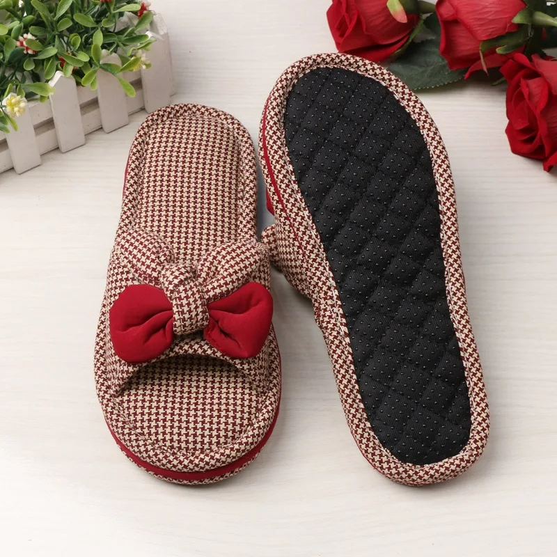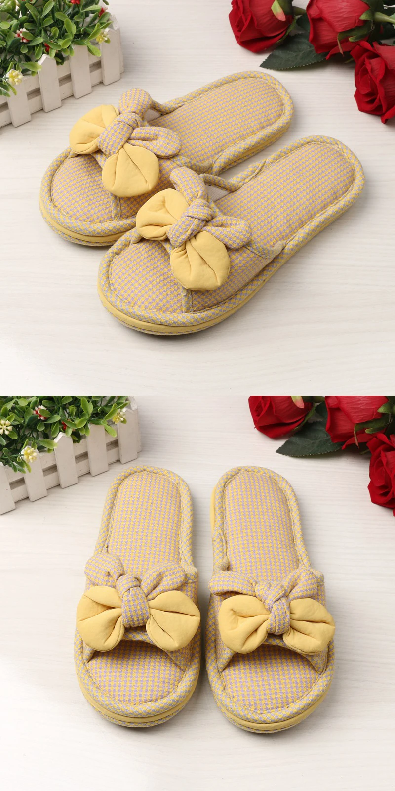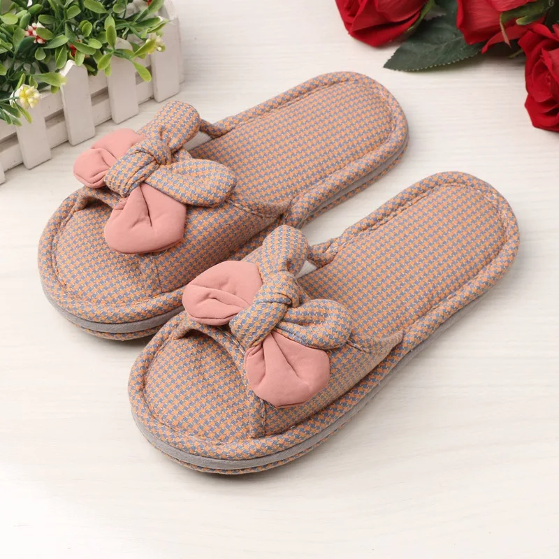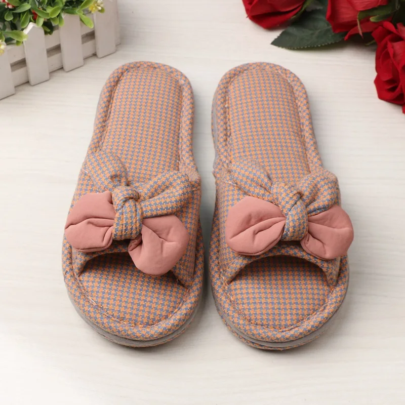 • Wholesale Autumn And Winter Thickened Cotton Fabric Home Bow Slippers Soft Sole Silent Female Bedroom Bow Slippers