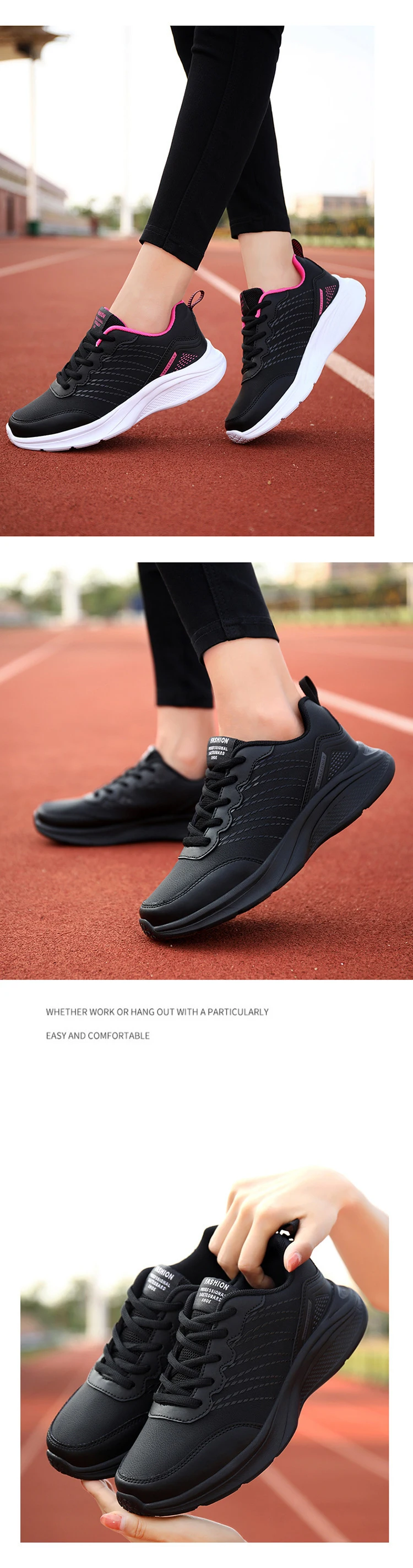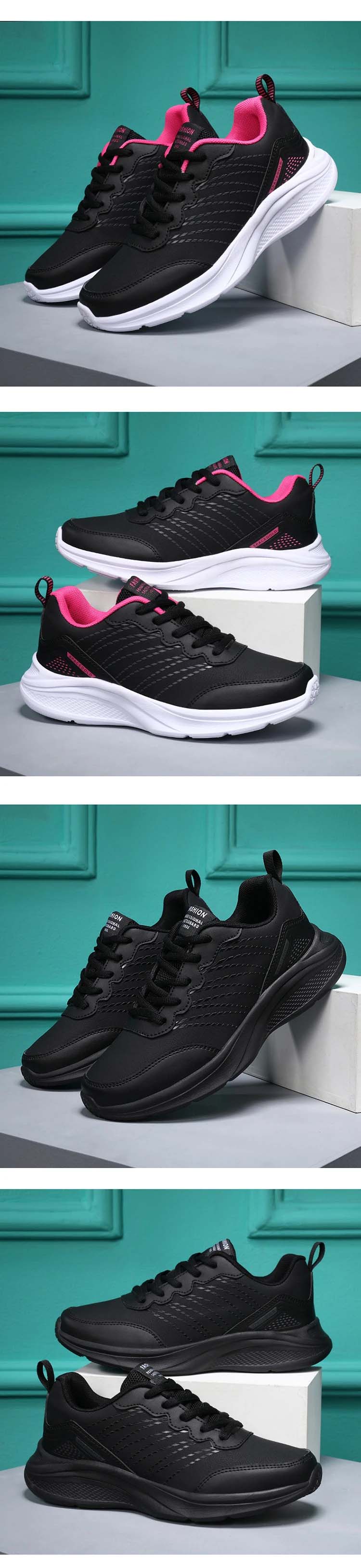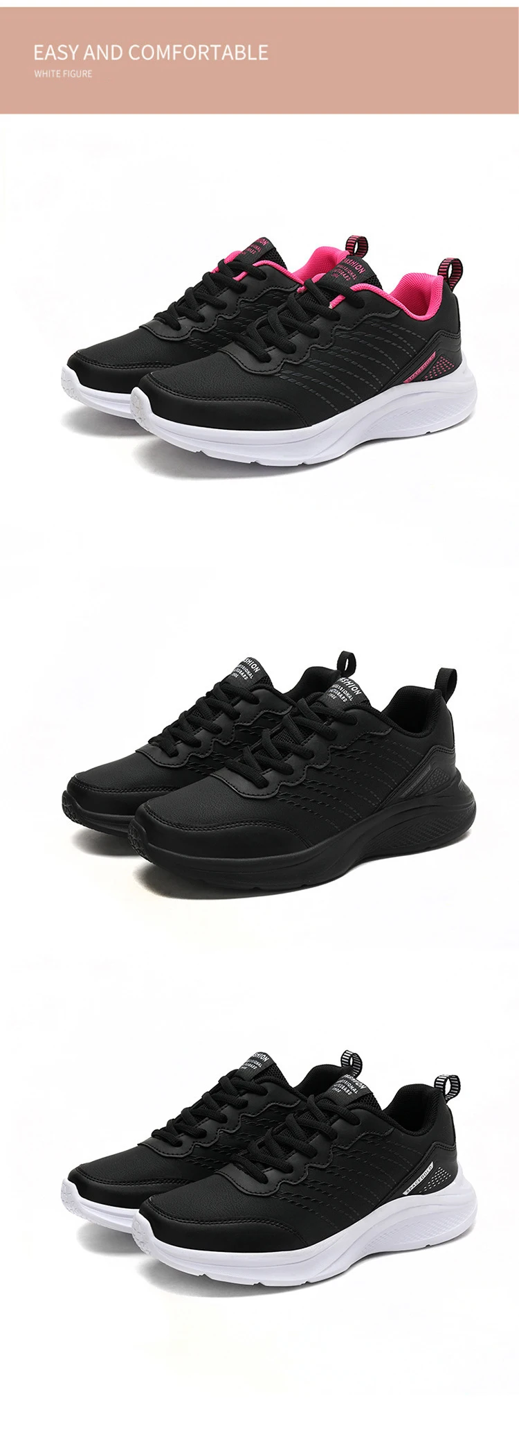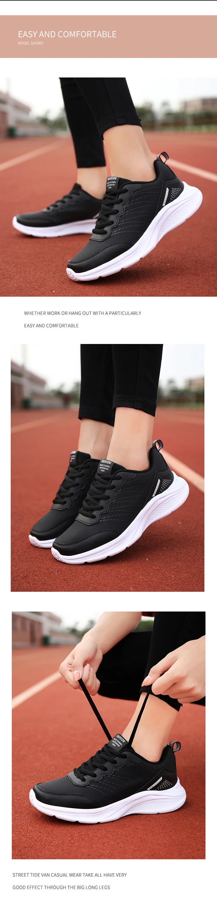 Wholesale Fashion Light MD Sole Leather Women Casual Sports Shoes Spring All Match Casual Women' s Black Sneakers Shoes